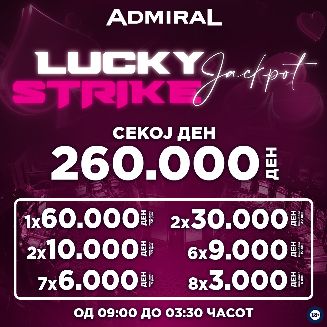 Во своeто портфолио ADMIRAL има голем број на џекпоти и бонуси, прогресивни и временски, глобални и локални. Со регистрирање на софистицираниот БОНУС СИСТЕМ, секој логиран играч се стекнува со право на посебни бенефиции.